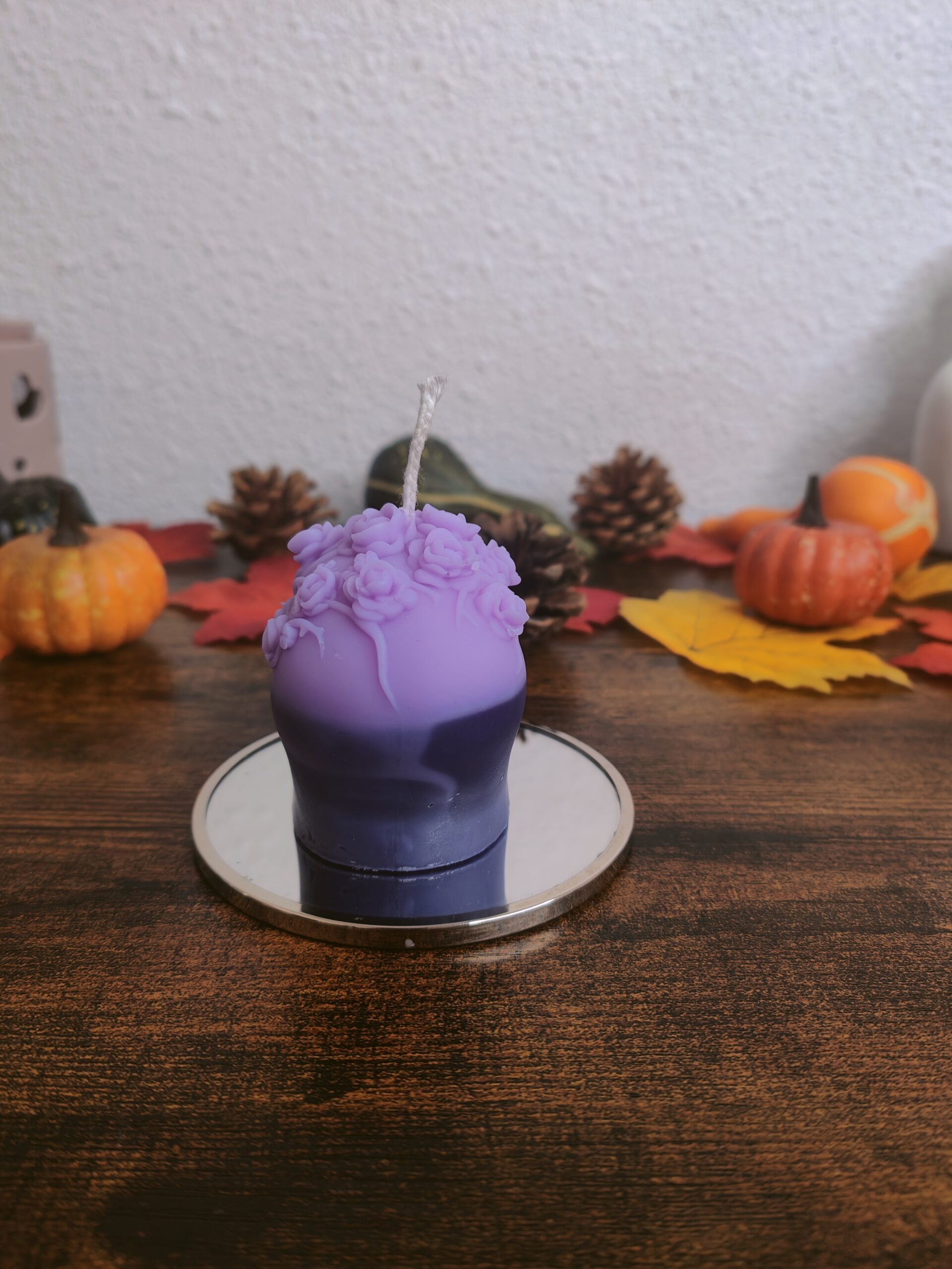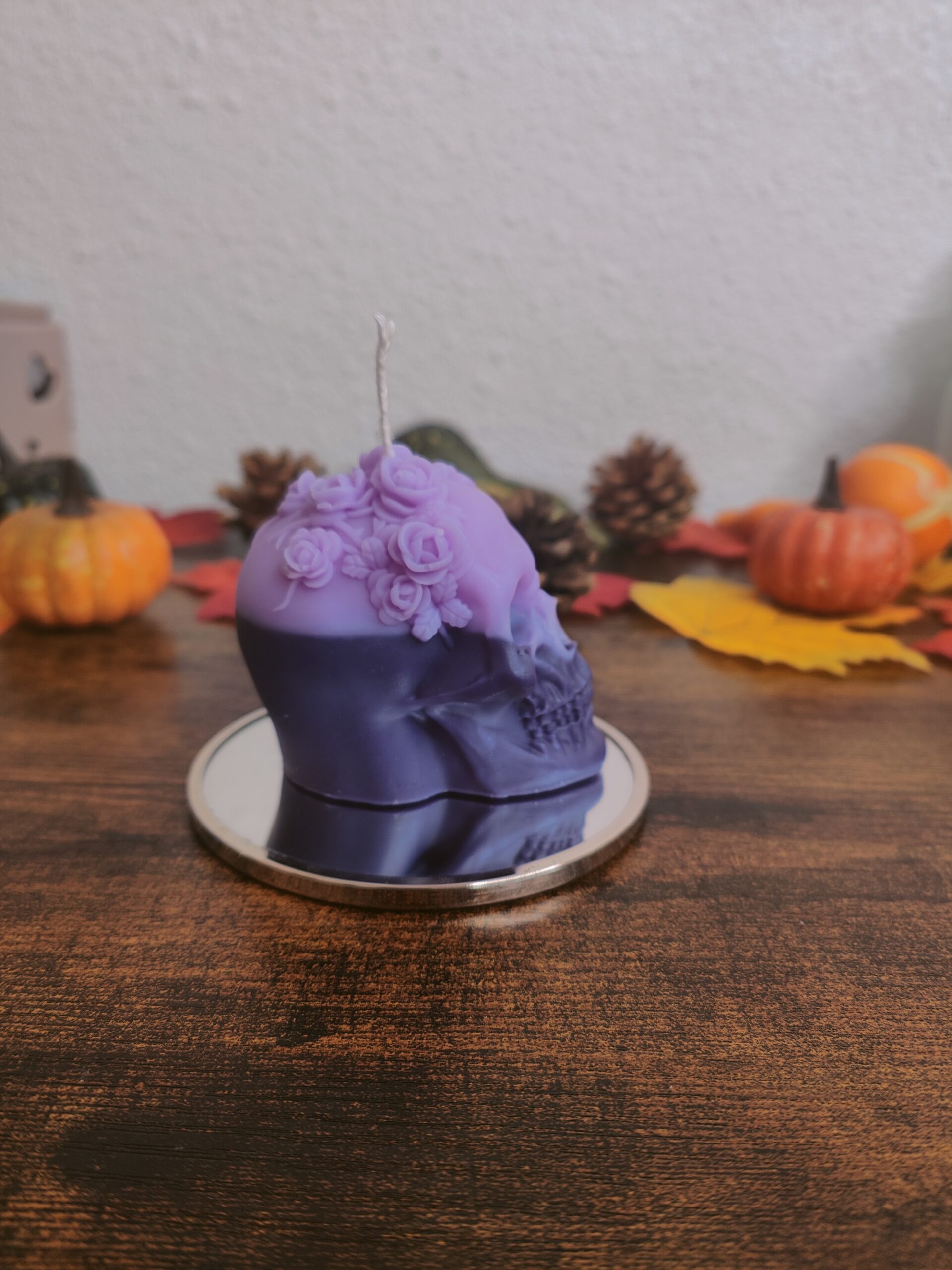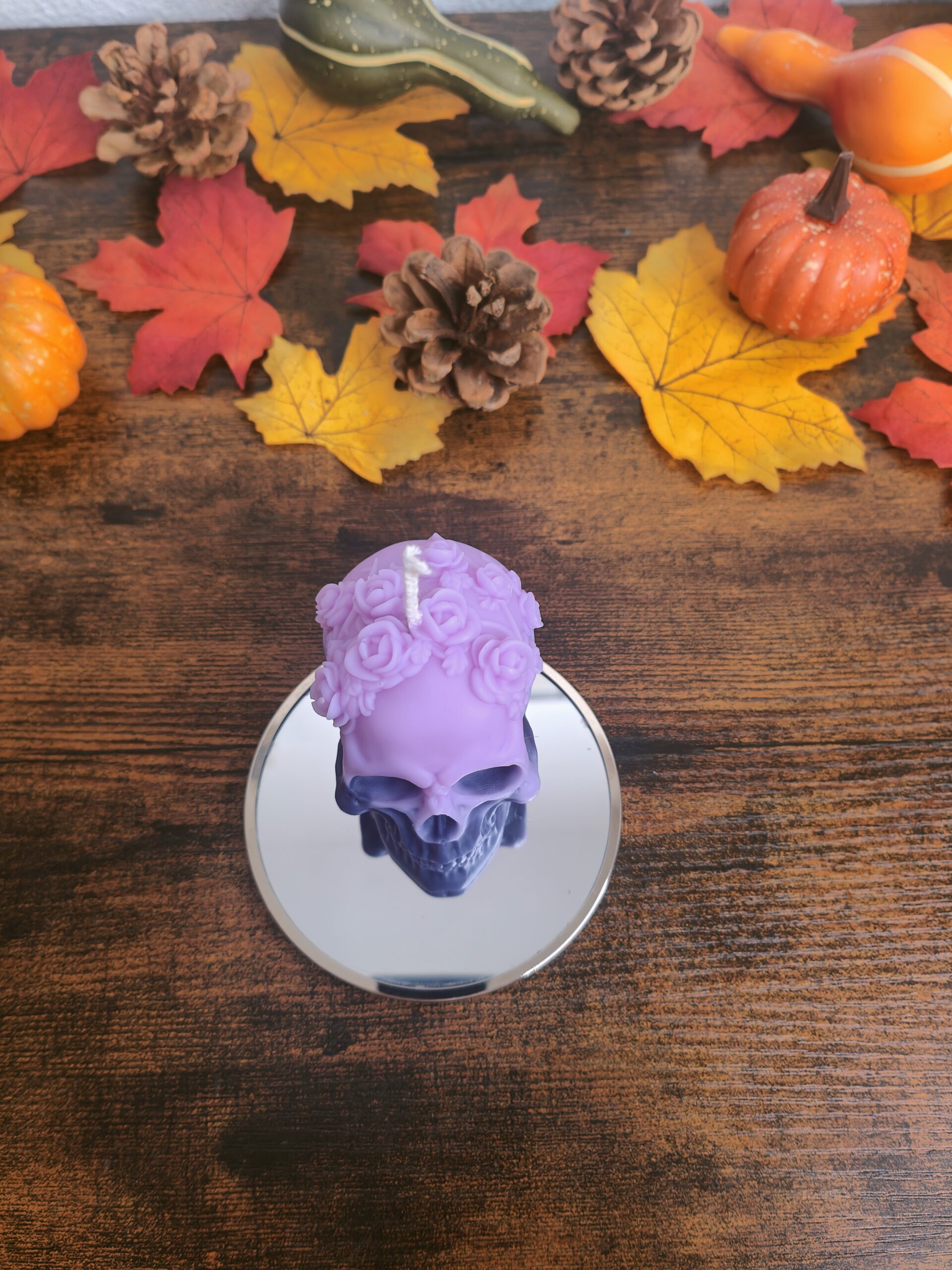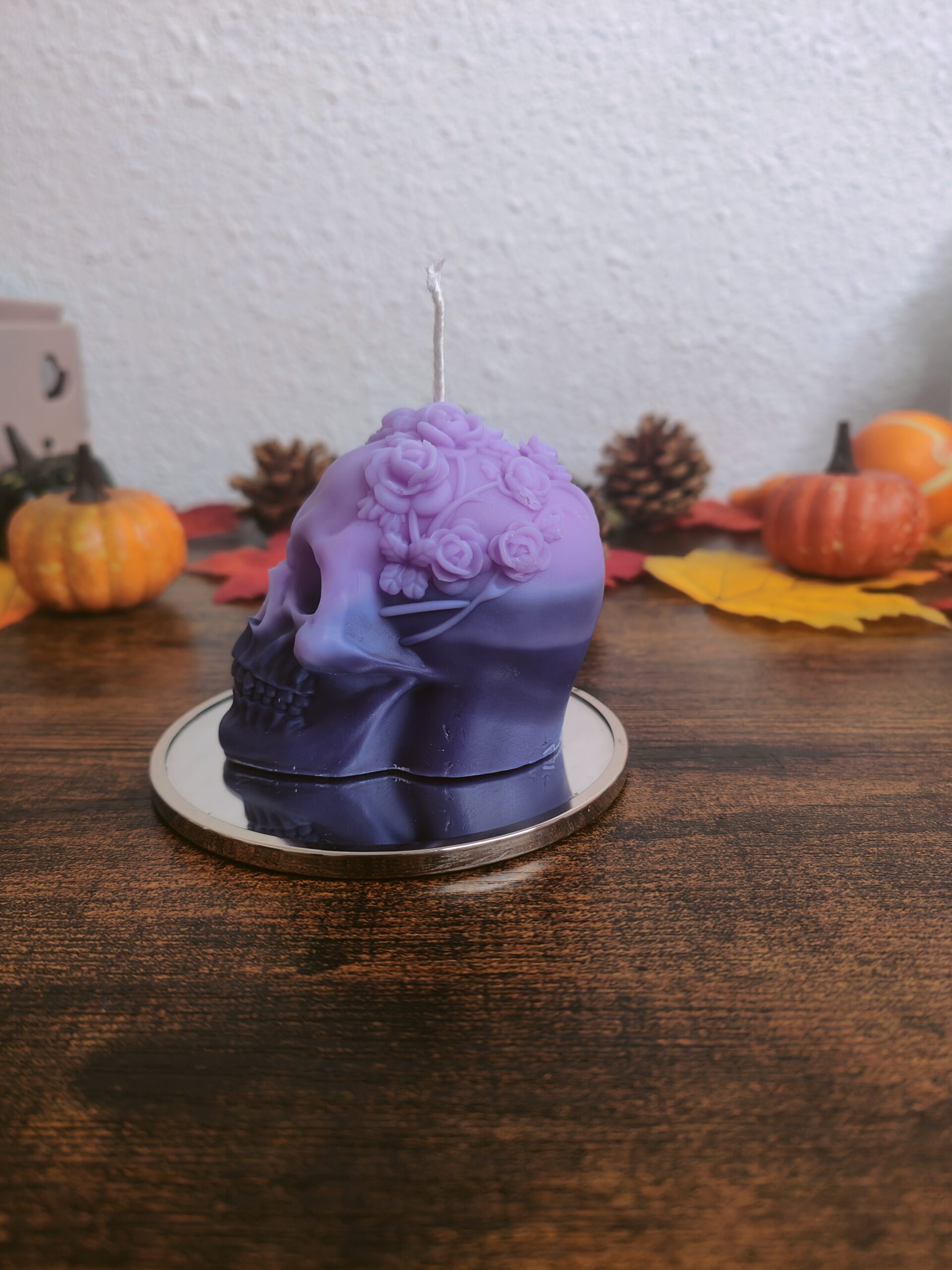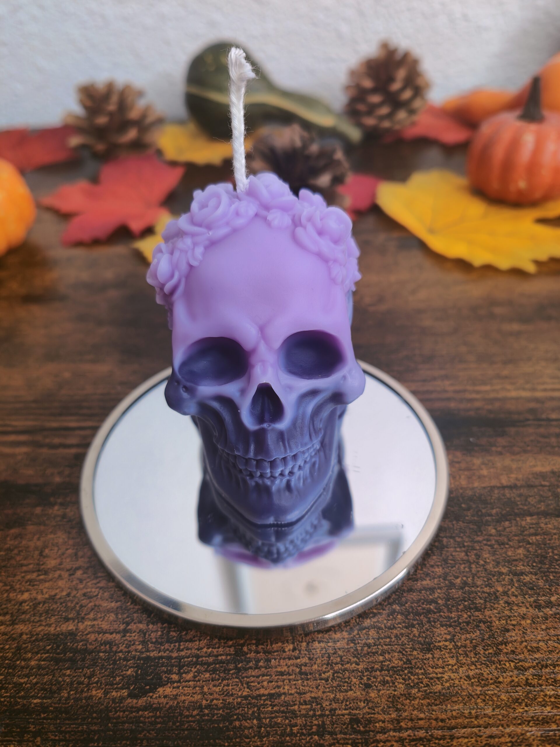 Apportez une touche mystérieuse et envoûtante à votre décoration d’Halloween avec notre bougie artisanale en forme de crâne orné d’une couronne de fleurs. Son dégradé violet mêle élégance et obscurité, parfait pour créer une ambiance à la fois sombre et raffinée.